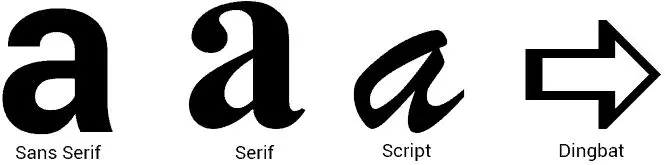 Existem 4 classificações primárias, nos quais a maioria das fontes existentes se encaixam: Sans Serif (sem serifa), Serif (com serifa), Script (simula a escrita à mão) e Dingbat (símbolos diversos no lugar das letras do alfabeto).